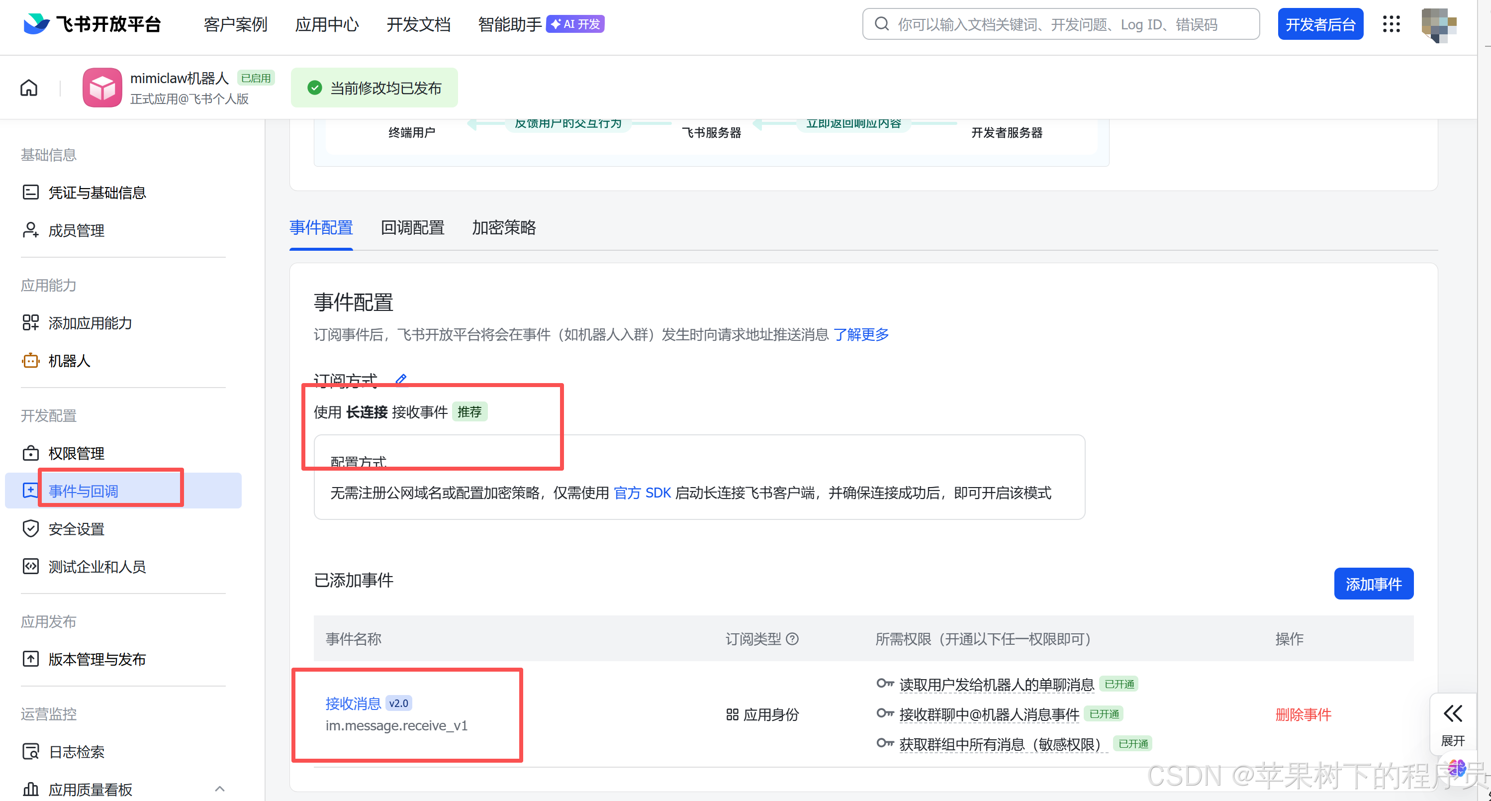 在飞书开放平台左侧导航栏单击事件与回调,在事件配置页签中单击订阅方式,选择使用 长连接 接收事件,单击保存。
