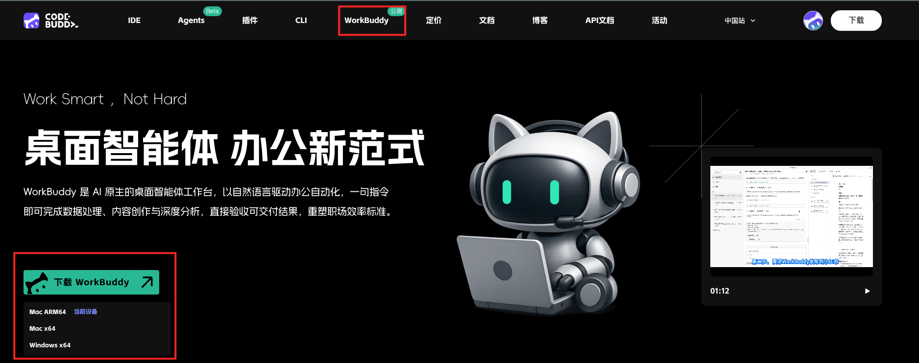 访问官网,在导航处选择 WorkBuddy,并选择符合自己电脑系统的版本进行下载安装即可。