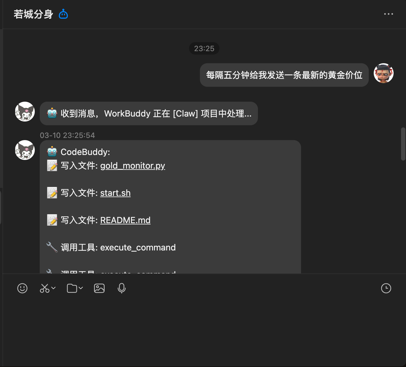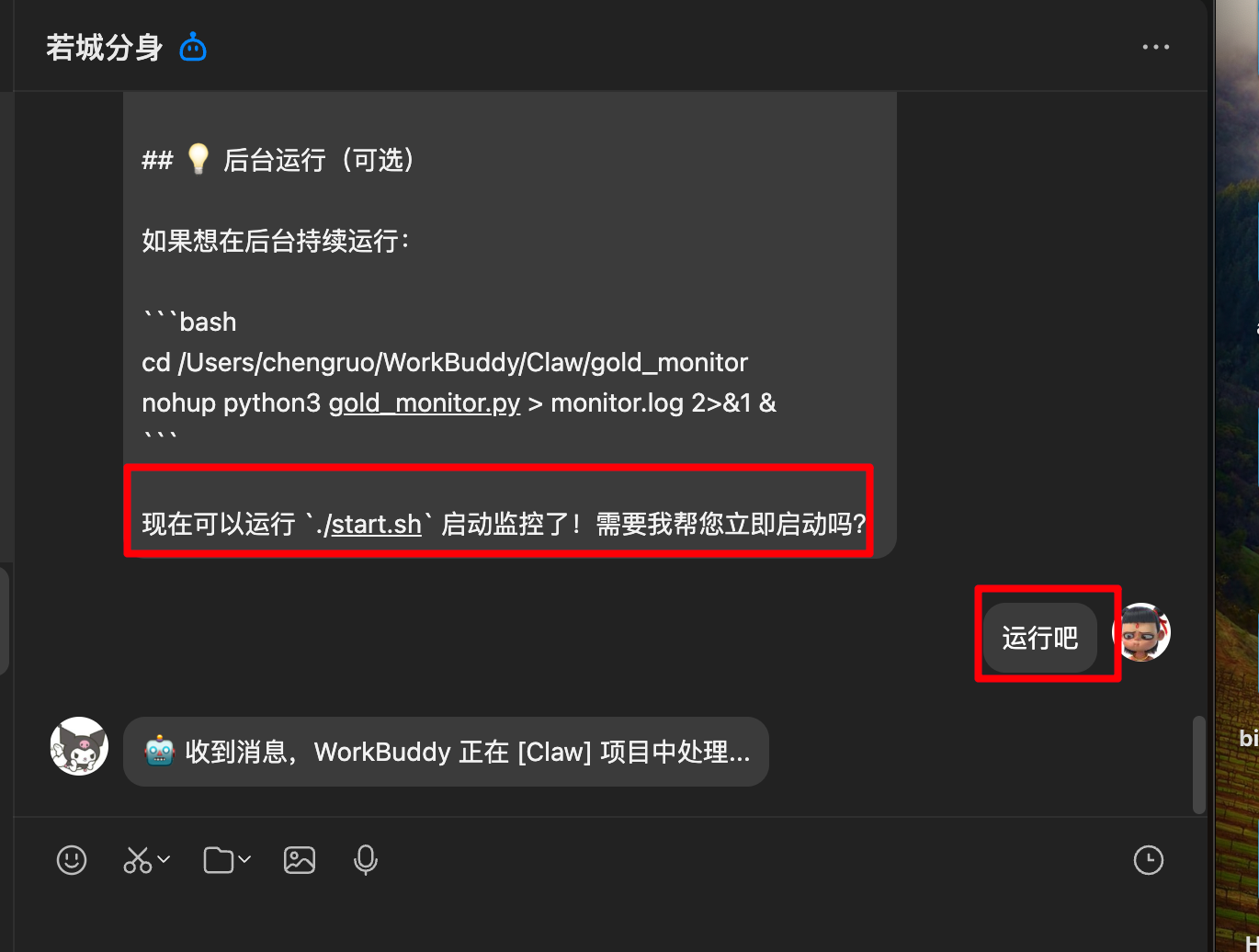 就这样,我们相当于拥有了一个 24 小时在线的"工人",随时帮我们监测黄金走势。