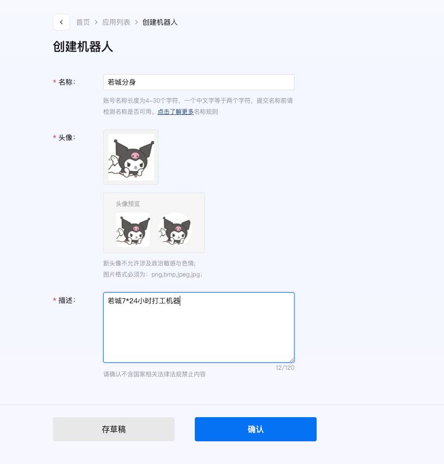 - 创建机器人,填写名称、头像及描述信息。