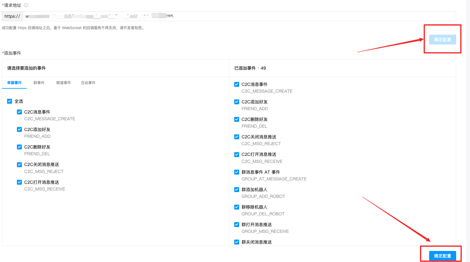 - 完成请求地址填写并添加所需事件后,点击「确认配置」按钮使配置生效,如下图所示。