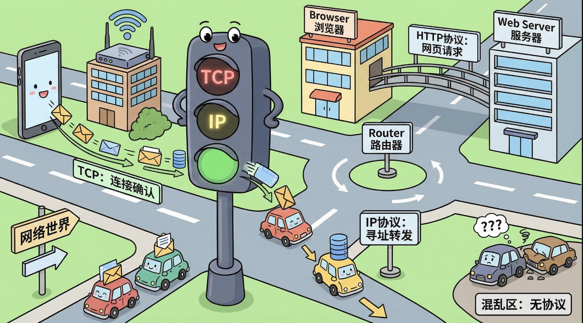 马路上的车辆和行人,要遵循“红灯停、绿灯行”“靠右行驶”“礼让行人”等规则——这些规则,就是“马路协议”。如果没有这个协议,马路就会混乱,到处都是交通事故。