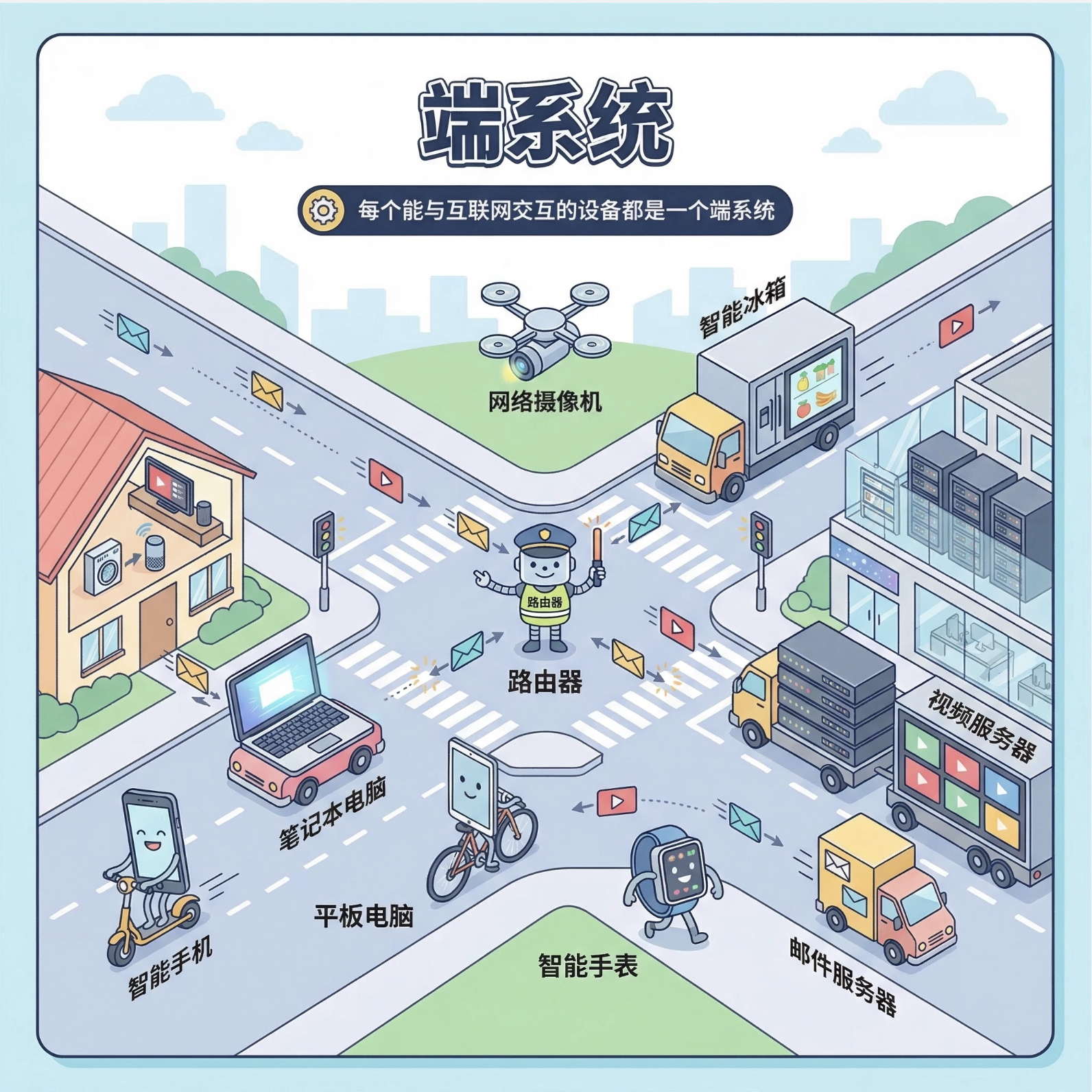 端系统(end system),其实就是我们常说的“主机(host)”——注意哦,这里的主机(host)不只是电脑,而是所有能接入因特网、发送或接收数据的设备,范围特别广: